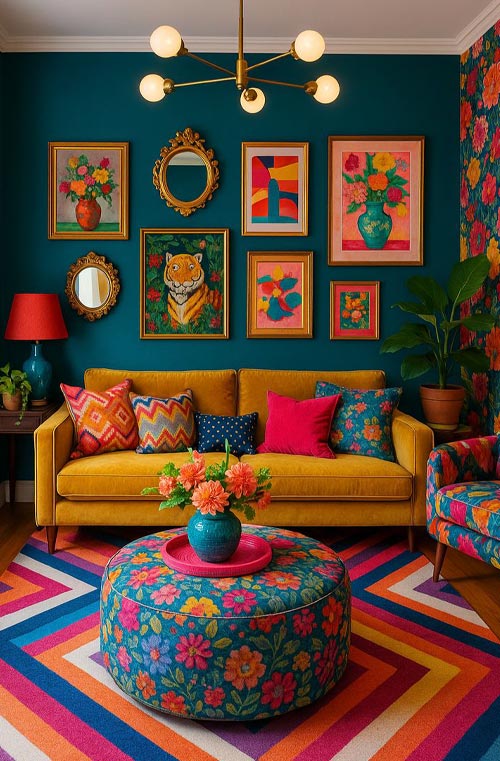 در این سبک، می‌توانید از رنگ‌های قوی برای دیوار یا مبلمان استفاده کنید، اما بهتر است آن را با رنگ‌های خنثی مانند سفید و بژ ترکیب کنید تا تعادل برقرار شود.