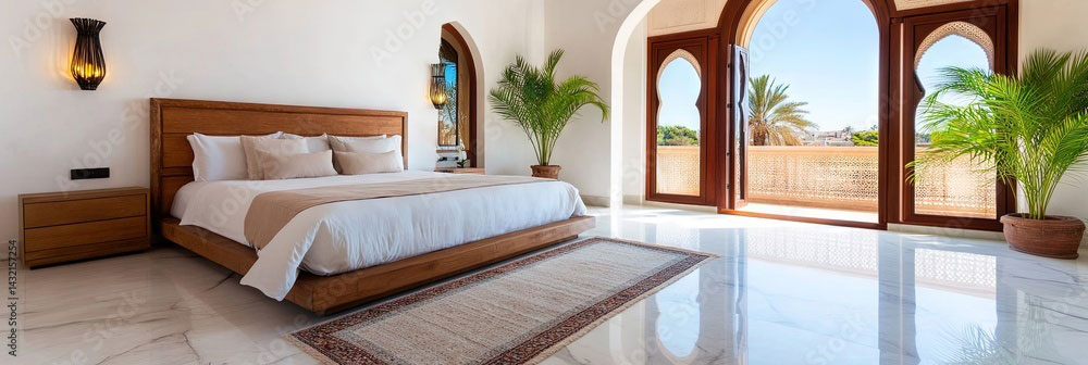 • قوس‌های اسب‌شکل (Moorish Arches): از بارزترین نشانه‌های معماری اسلامی-مراکشی که در درگاه‌ها و پنجره‌ها استفاده می‌شود.